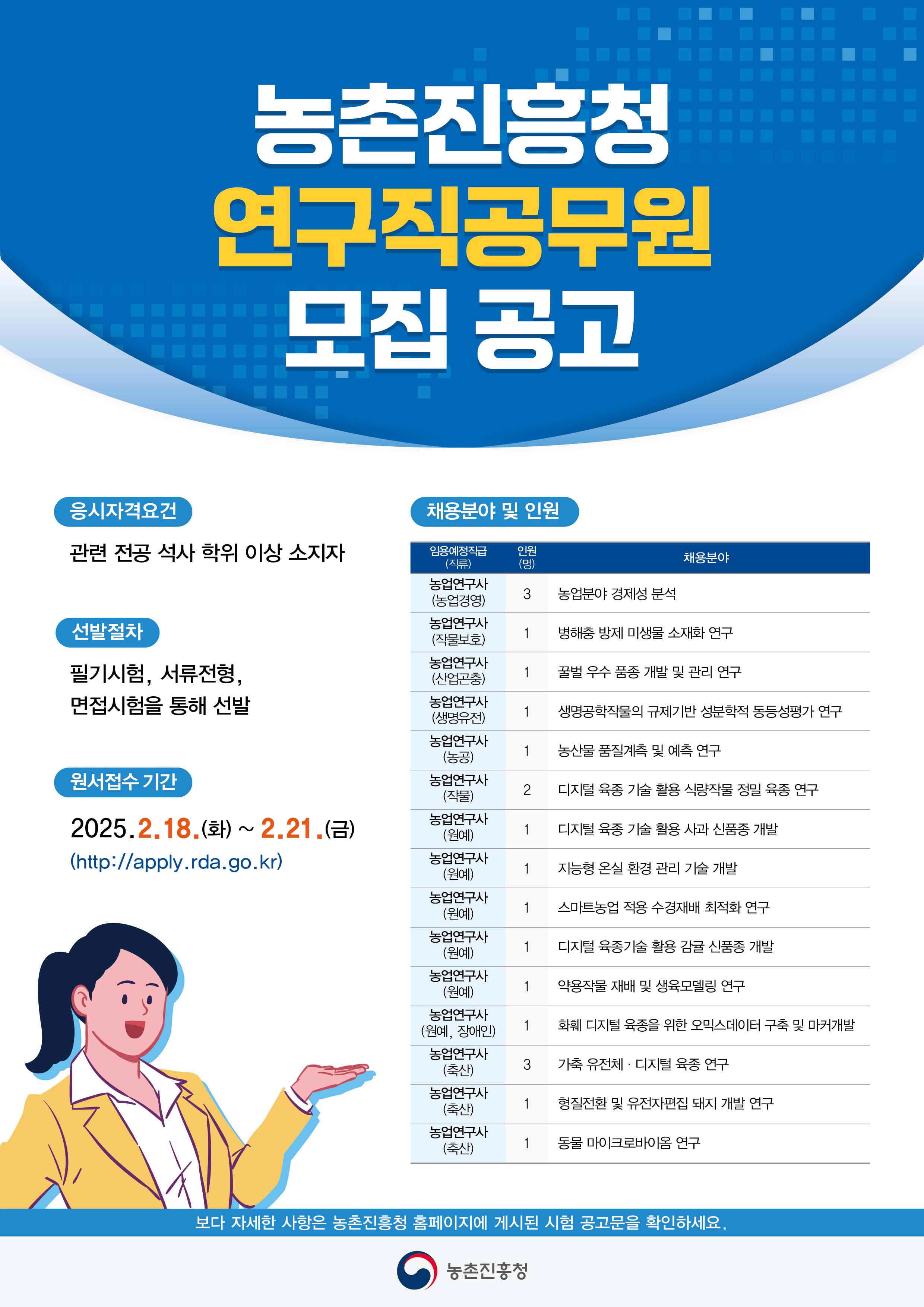 71 농촌진흥청 연구직 공무원 경력경쟁채용 공고 관리자 25-01-20 394   2025 연구직 경력경쟁채용 모집 공고 포스터.jpg