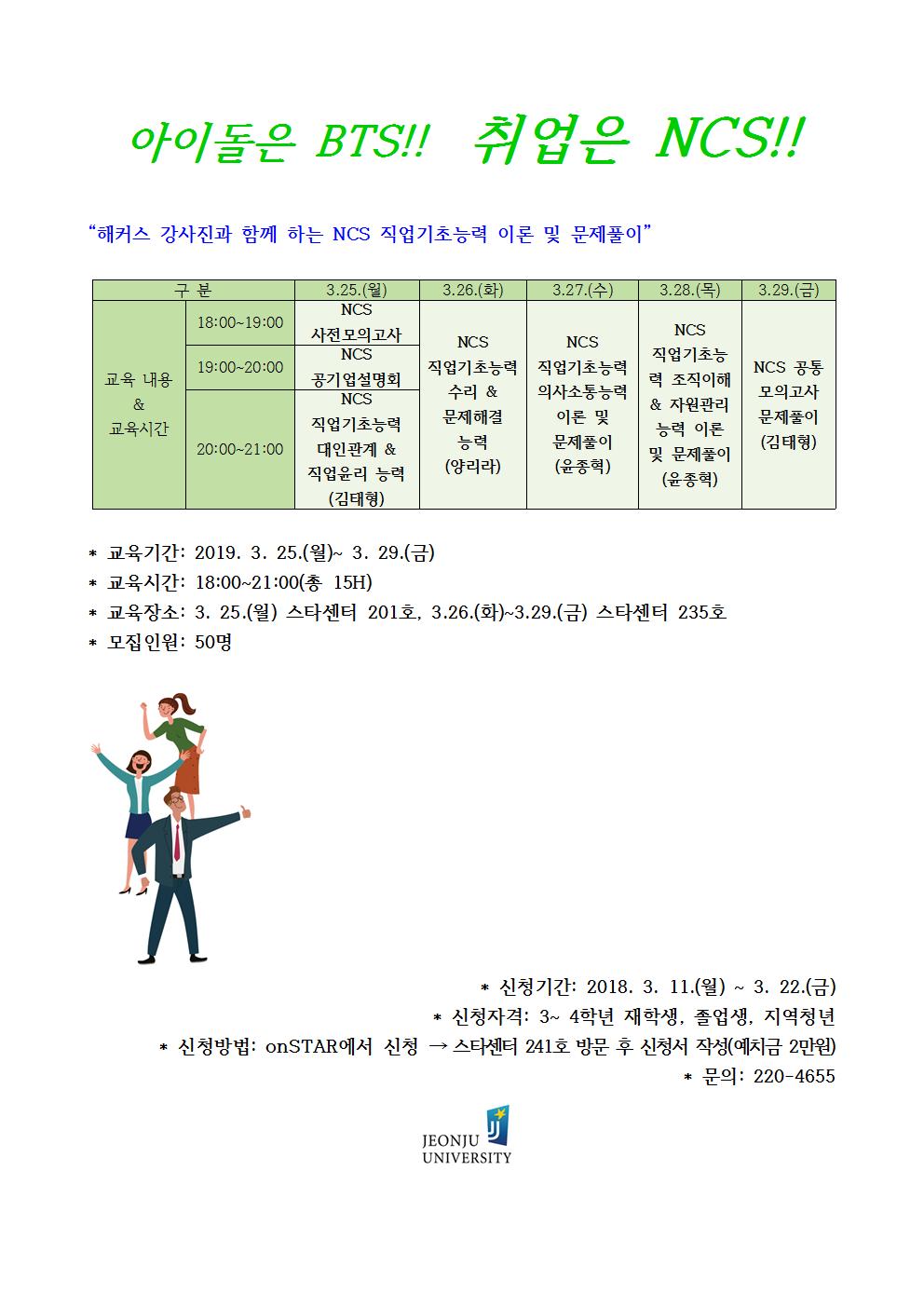 | 50 | NCS 직업기초능력 교육 및 시험 참여자 모집 | 대학일자리센터 | 19-03-11 | 756 |