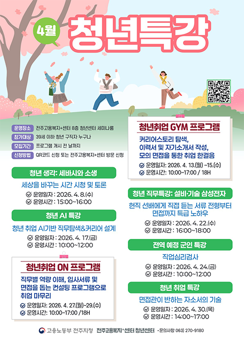 | 대학일자리플러스센터 | [특강] [전주고용센터]청년 AI 특강 | 2026.04.17 ~ 2026.04.17 | 2026.03.19 ~ 2026.04.12 | 6 / 10 |